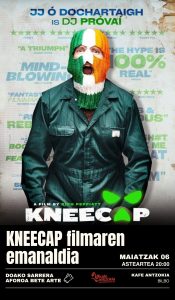 Kneecap filma proiektatuko da 20:00etan, doan eta euskarazko azpidatziekin. Aurretik, 19:40ean hasita, Pantailaldia ekimenaren aurkezpena eta DYMXN rapero irlandarraren emanaldi laburra izango ditugu eta, ondoren, filma ikusi ahal izango da. Sarrera doan har daiteke sarrerak.kafeantzokia.eus webgunean eta Zenbat Gararen bulegoan.