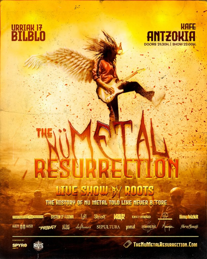 THE NU METAL RESURRECTION [LIVE SHOW BY ROOTS®] ikuskizun ikusgarria da: musika zuzenean, argiztapen berezia, eszenaratzea, irudiak eta narrazioa uztartzen dituena, Nü-Metalaren artista handienen historiaren bidez gidatuko gaituena — Linkin Park, Korn, System of a Down, Rage Against the Machine, Limp Bizkit edo Slipknot, besteak beste.